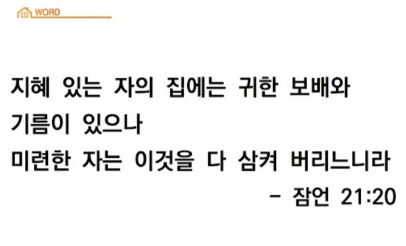 “지혜 있는 자의 집에는 귀한 보배와 기름이 있으나 미련한 자는 이것을 다 삼켜 버리느니라.” There is Treasure to be desired and oil in the dwelling of the wise; But foolish man spendeth it up.