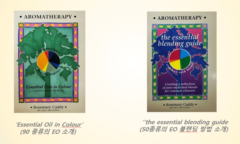 첫 번째 모임으로 선정된 아로마 전문서적은 영국의 에센셜오일 전문가인 Rosemary Caddy 교수가 쓴 'Essential Oils in Colour'라는 책과 'the essential oil blending guide'라는 책자로서, 총 90개의 에센셜 오일의 약리성분을 칼라 패턴이라는 독특한 기법으로 오일 각각의 효능을 분석하고 각각의 적용방법을 소개하는 책과 총 50종류의 에센셜오일 블렌딩 기법을 소개하는 책에 대해서 공부할 예정이다.