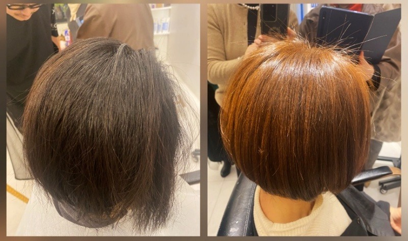 ✔ 기존 모발 색을 어둡고 따뜻한 브라운 계열로 ‘톤 보정’